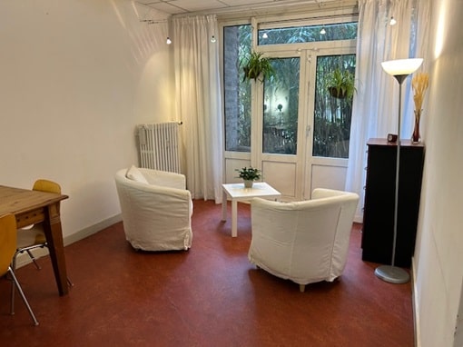 Aanwezig: 2 fauteuils, salontafeltje, electrische behandeltafel, verrijdbare behandelkruk, grote tafel en 2 stoelen.
